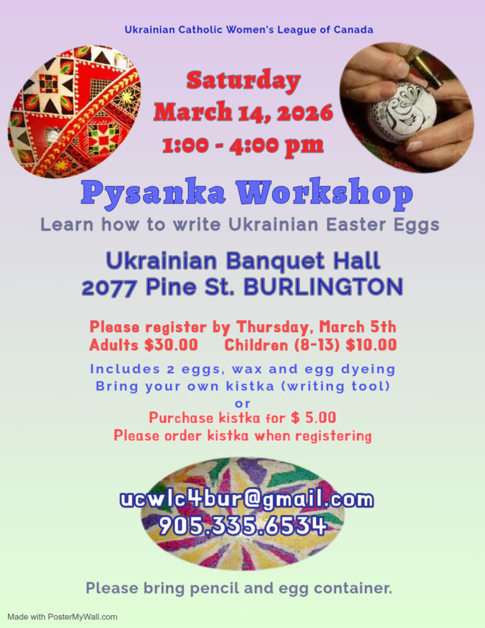 The Holy Protection Branch of the Ukrainian Catholic Women’s League of Canada warmly invites you to attend our annual workshop on the time-honoured tradition of writing Ukrainian Easter eggs (Pysanky). This event sells out quickly, so register and reserve your spot today! |