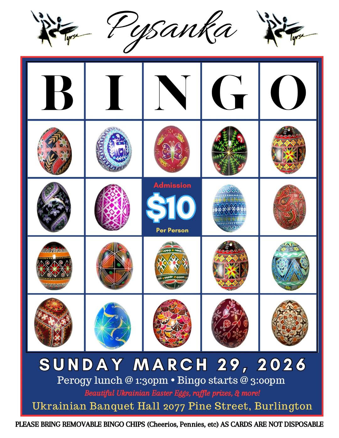 Tyrsa Ukrainian Dance School invites you to join a delightful, family-style Bingo game, with hand-painted Easter eggs (Pysanky) imported from Ukraine as prizes. With a delicious Ukrainian lunch, you don’t have to be Ukrainian to enjoy this wonderful event!" |