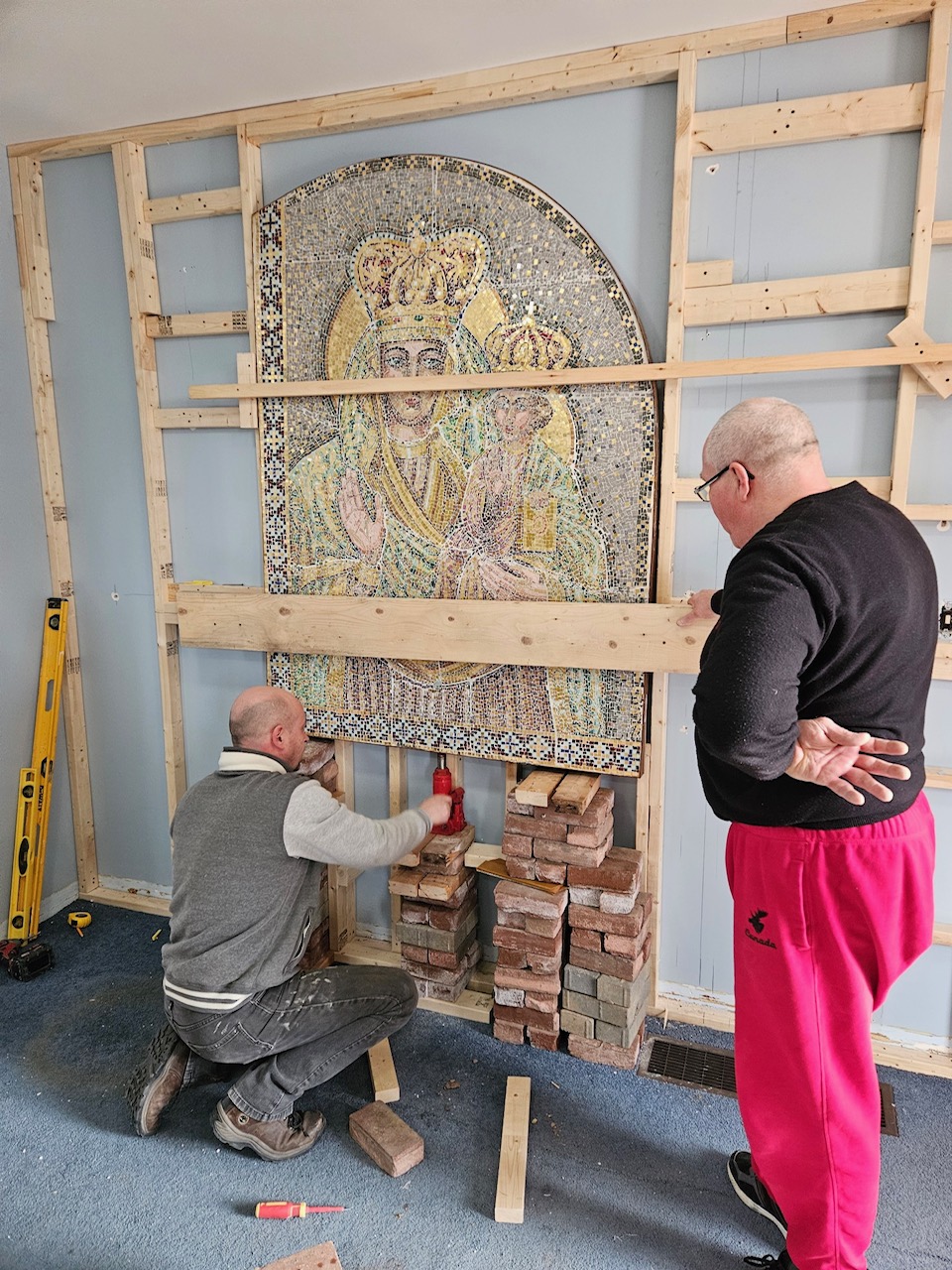 Thanks to the initiative of our parish members Mr. Serhii Vyarvelskyy, Mr. Andriy Barulin, and Mr. Volodymyr Demchuk with the chief-carpenter Mr. Volodymyr Horoshko, the mosaic was successfully installed in the church vestibule just before Easter 2025. Now the mosaic adorns the vestibule of the church and welcomes you every time you enter our church temple.